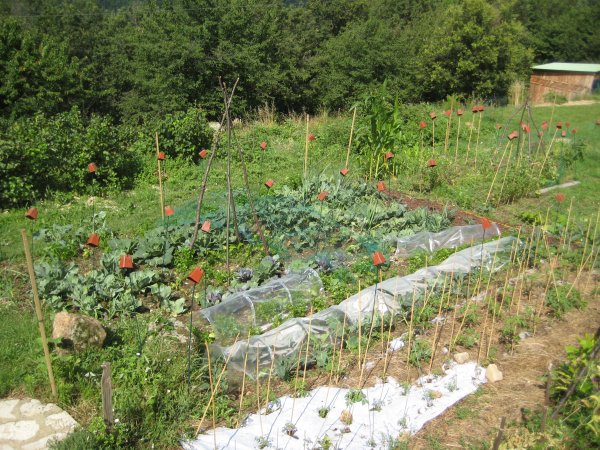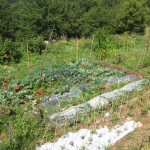 Then under threatening skies it was back to the lower vegetable bed to do some fine net working. Off with the large tennis court type net around the perimeter (only took about six hours to put up) and on with a more targeted netting directly over the most precious crops. It is more discreet and hopefully will save the lettuce and chard from attack. Even the lettuce is growing back from the cropped crowns. Amazing.