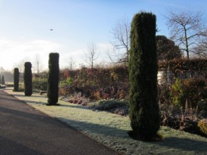 As you can see by the frost on the ground, this is winter. But the cypress trees that act as little exclamation marks in the border are bright and cheery. And flat topped.